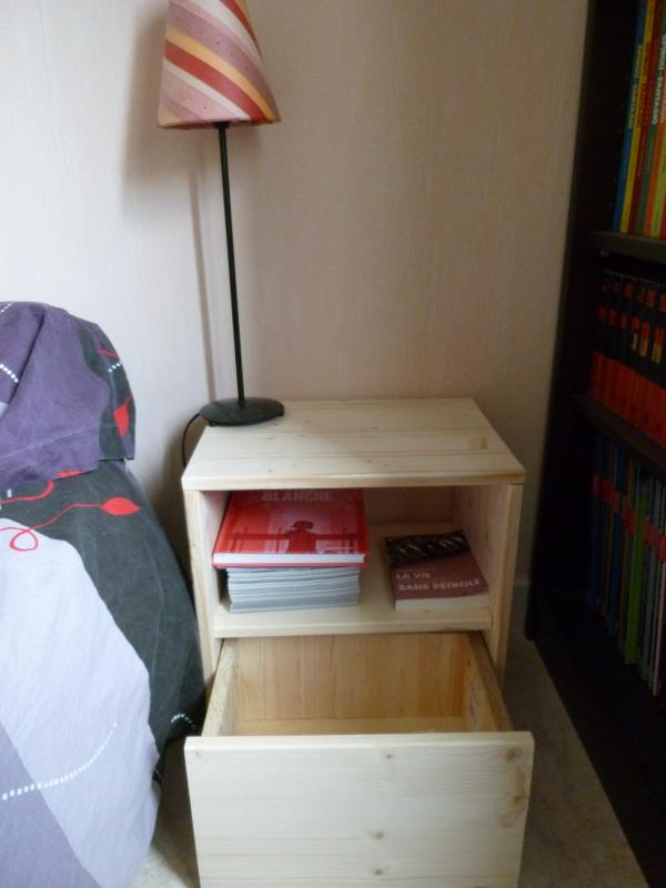 Fraîchement déménagé dans une nouvelle maison, Aurélie et moi avons besoin de quelques meubles supplémentaires. Le plus important pour nous étant une grande bibliothèque. Le projet de construction est en cours, et en attendant que des peintures sèchent, je me suis attelé à la construction de deux tables de chevet car nous utilisions pour l'instant des cartons du déménagement.