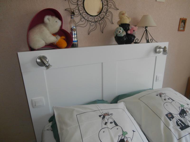 il y a quelque temps j avais acheté chez Ikea une tête de lit pour mettre dans la "chambre d amis" - mais au niveau de l éclairage ce n était pas le top - on a enfin trouvé ce que l on voulait et M Bricolo a oeuvré : il a mis en place les petites lampes en alu brossé et surtout il a installé les interrupteurs en les encastant directement dans la tête de lit