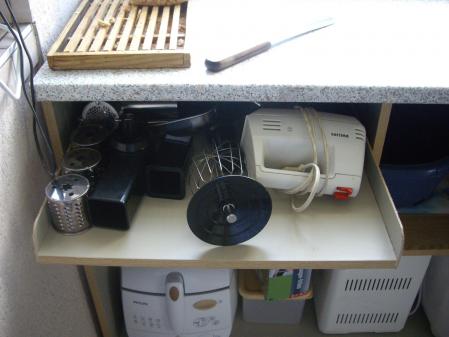 pour ranger tous les ustensiles de mon nouveau robot mon mari m a fait ce petit tiroir sous le meuble qu il avait fait cet hiver - j avais émis cette idée et le temps de cogiter, d aller acheter les rails de tiroir et voilà 2 jours après j avais mon petit tiroir .............