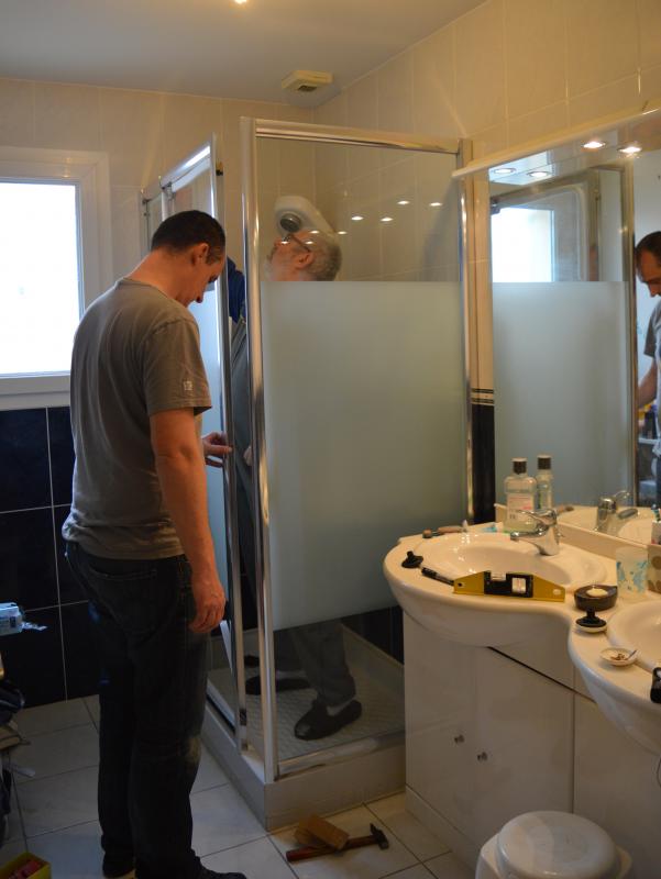hier donc nous étions chez ma fille afin que Claude puisse aider mon gendre à installer les parois pour leur douche - le Père Noël ayant été bien généreux à leur égard, ils avaient pû s offrir donc l aménagement de leur rêve pour la salle de bains mais comme elle était en verre il fallait être 2 pour l installer en toute sécurité et facilité sous l oeil attentif d Annalie bien intigrée par toute cette agitation