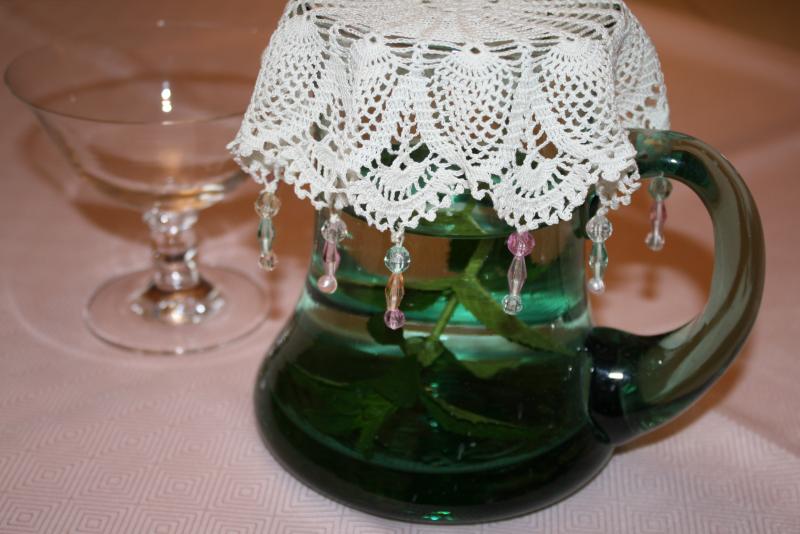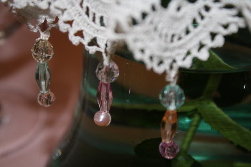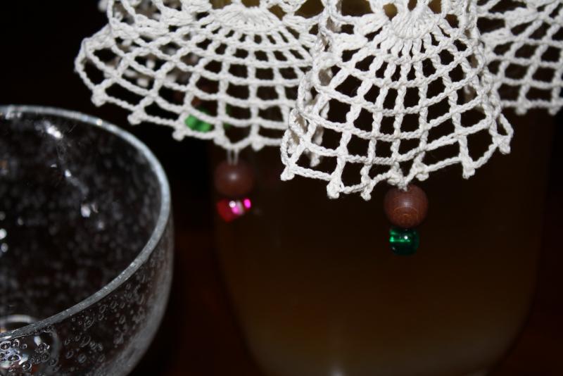 Voici une manière amusante de reconvertir les napperons hérités de nos mères et grands'mères... demandez à vos filles ou petites-filles de vous prêter leur boîte de perles... et amusez-vous. Très utile pour protéger vos boissons des insectes ou de tout autre objet non identifié !