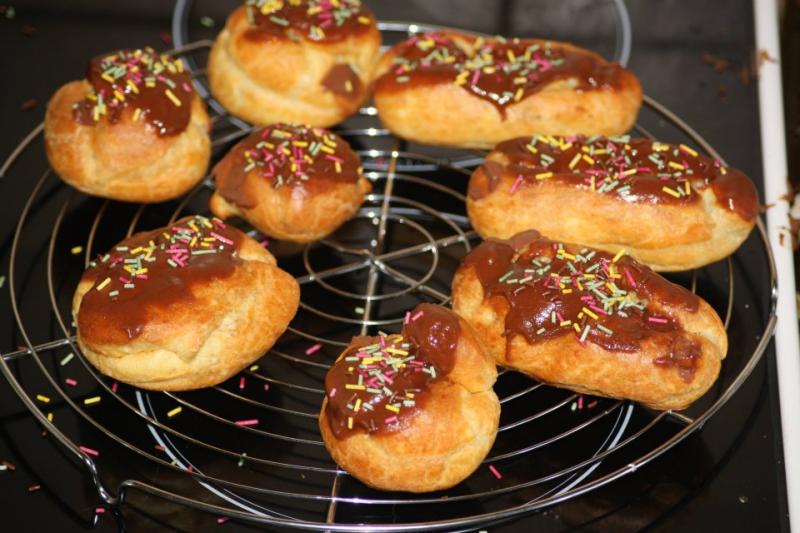 Préchauffer le four à 200° Mettre les liquides à bouillir avec le beurre coupé en morceaux, le sucre et le sel. Verser la farine d'un seul coup et mélanger afin d'obtenir une pâte homogène qui se détache des parois de la casserole et de la cuillère, cuire quelques instants sur le feu. Laisser refroidir quelques minutes la pâte. Toujours dans la casserole, ajouter un par un les oeufs. A l'aide d'une poche à douille dresser des boudins sur une longueur de 6 cm (ou plus si vous êtes gourmands !!) sur une plaque recouverte de papier sulfurisé. Mettre au four pour 20 min. Préparation de la crème pâtissière : Mettre le lait à bouillir. Blanchir les oeufs et le sucre ajouter la farine et le cacao. Verser la moitié du lait bouillant sur les oeufs mélanger pour délayer le mélange et reverser dans la casserole avec le reste du lait. Mélanger sans cesse jusqu'à épaissisement de la crème (à la reprise de l'ébullition votre crème est prête). Débarrasser dans un plat et laisser refroidir. Le glaçage : Mettre à fondre au bain marie le chocolat et l'huile. Garnir les éclairs à l'aide d'une poche à douille si vous êtes doué :-) sinon faites comme moi, ouvrir les éclairs sur le côté, garnir de crème et refermé (simple mais pas super esthétique !) Tremper délicatement les éclairs dans le glaçage et laisser prendre frigo. |