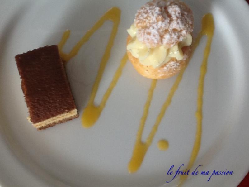 Pour 4 pers: Pour les tuiles aux goyaviers: -150g de sucre -75g de beurre ramolli -50g de jus de goyaviers 30g de farine Chauffer le four à 180° Blanchir le sucre et le beurre ramolli,ajouter ensuite le jus de goyavier et la farine,bien mélanger. Étaler sur du papier sulfurisé mettre au four pendant 10mn. A la sortie du four couper selon vos envies vous pouvez faire prendre forme autour d'un cercle en inox Réserver. Pommes au four: -4 pommes -20g de beurre -20g de sucre Laver et enlever le trognon des pommes les mettre dans un plat allant au four mettre un peu de beurre et de sucre à l'intérieur de chaque pomme cuire pendant 20-25mn Coulis aux goyaviers: 100g de goyavier lavés mixés et filtrés. |