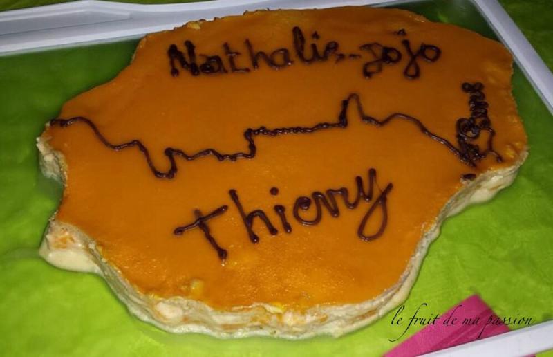 Sur la première partie étaler la crème -mangue puis placer l'autre génoise,y verser le coulis étaler à la spatule et laisser prendre au frigo 3h.