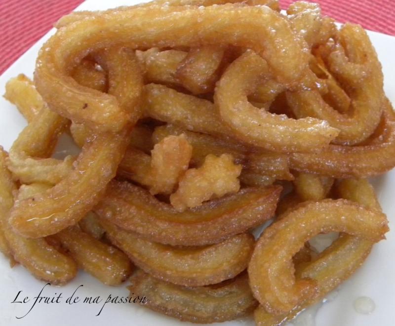 Dans une casserole mettre l'eau ,le beurre ,le sel,et le sucre.Porter à ébullition.Ajouter la farine d'un coup et mélanger énergiquement en cuisant 5mn.Laisser tiédir puis ajouter les œufs un à un en les incorporant bien à la pâte.Ajouter la farine de riz,la fécule,et la poudre d'amande.Mettre la pâte dans une poche .Faire chauffer l'huile quand elle est bien chaude placer la poche au dessus de la casserole.Appuyer fortement puis couper aux ciseaux la quantité de pâte voulue laisser dorer,les poser sur du papire absorbant avant de les plonger dans le sirop pendant 10mn.
