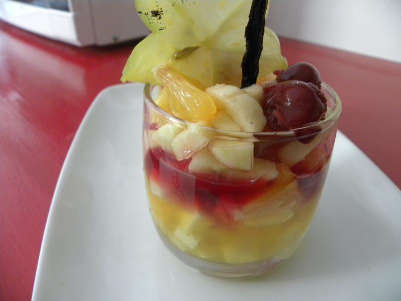 2 petites bananes 1 mangue 1 pitaya 4 fruits de la passion Le jus d'1 citron vert 1 bouchon de rhum charrette 15cl de sirop de sucre de canne 1 gousse de vanille fendue Couper tous les fruits ajouter le jus de citron,le sucre de canne la gousse de vanille et le rhum bien mélanger.Mettre au frais jusqu'au service. Salade de fruits aux goyaviers