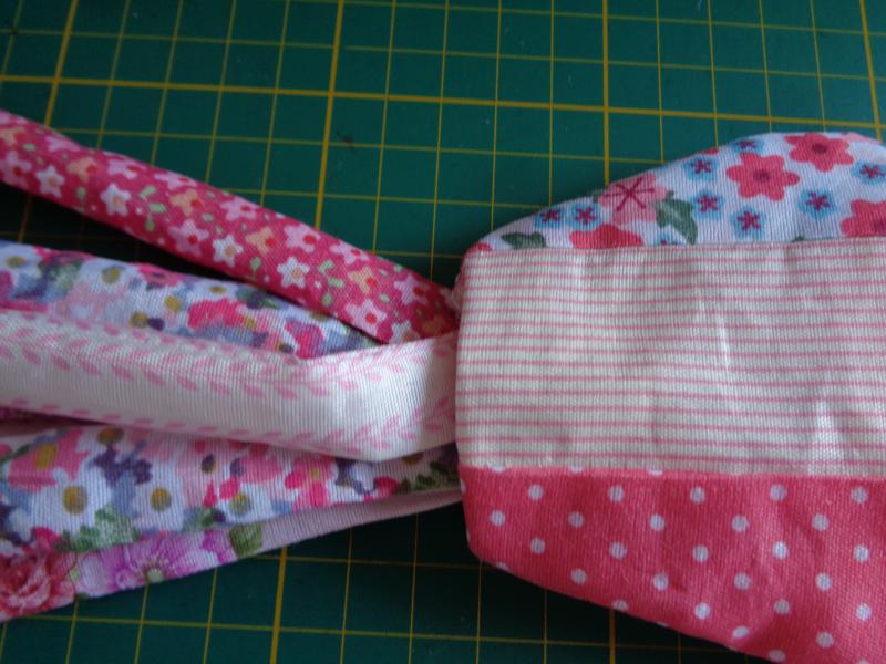 La préparation : découpez des petites bandes de tissu de 4,5 cm x 13 cm : il en faudra 3 de 3 tissus différents puis 2 de quatre autres motifs. Les mesures paraissent bizarres mais c'est un tuto en anglais avec donc des mesures en inches. En plus j'ai tout divisé par deux parce que mon modèle ne doit pas être très grand. Pour ne pas perdre de tissu, j'ai aussi prévu d'en faire trois en même temps, mais les indications que je donne sont pour un modèle bien sûr ! Cousez d'abord 3 x 3 bandes de tissu ensemble dans la longueur... 2ème étape : pliez les 4 x 2 bandes une par une sur le plus long côté. Cousez et prévoyez un angle sur un bout avant de retourner les tuyaux...