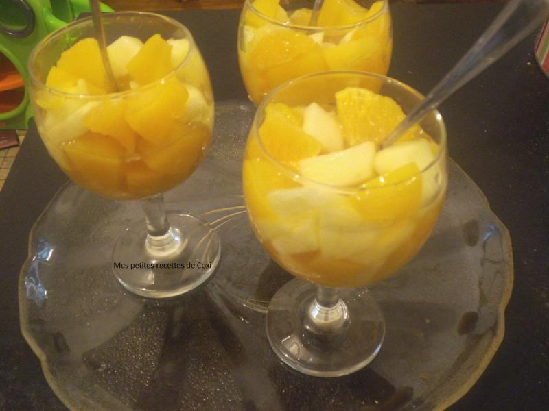 Ingrédient pour un saladier : 1 boite de pêche en sirop 3 pommes 2 oranges jus de citron Préparation : Épluchez les pommes et les couper en petits morceau les citronné et les mettre dans la saladier. Faites de même avec l'orange ou si possible avec un couteau pour enlever la peau et prélever que les suprêmes d'orange ,les couper en deux . Les versez dans le saladier contenant déjà les 3 pommes . Incorporez les pêches coupés en morceaux ainsi que le jus de c'elles ci ,vous pouvez ajoutez de la vanille si vous le souhaitez . |