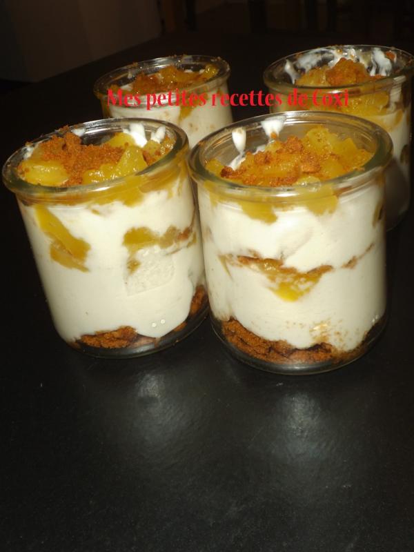 Ingrédient pour 4 personnes: 2 grosse pomme golden 300 g de fromage blanc sucré cannelle en poudre confiture de lait de Raff'olé ici jus d'un citron Préparation : Commencez par épluché les pommes ,les couper en dés et les mettre dans un récipient pour les citronnée pour éviter que les pommes noircisse . Pans un bol mettre votre fromage banc que vous sucré à votre gout ,ajoutez y de la cannelle pour ma part 1 C à café suffit. Au fond de votre verrine ,disposer de la confiture de lait ,des pommes dessus ensuite du fromage blanc et une dernière couche de pomme . Mettre de nouveau au frigo ou manger de suite . |
