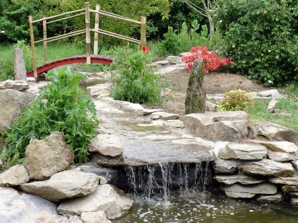 Le bassin prend forme et le petit pont est positionné, plus tard la rambarde sera peinte en rouge.