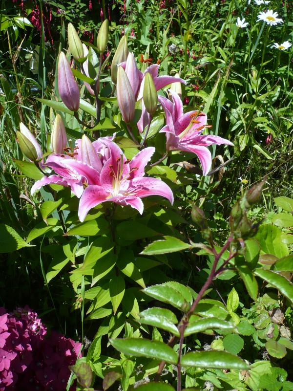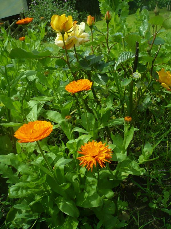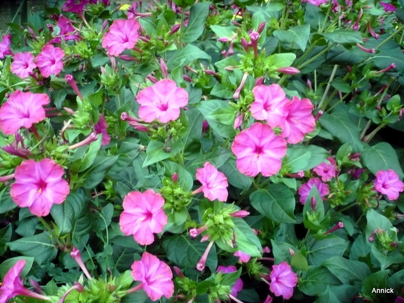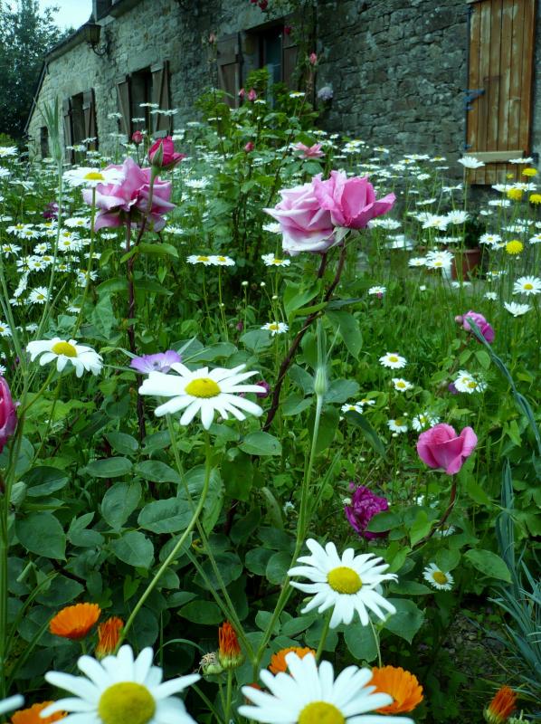 Là ce sont des oeillets de poète qui s'ouvrent, il y en a de plusieurs couleurs ! Il y a plusieurs années, j'ai cueilli des marguerites dans les champs, je les ai repiqué au jardin, quand elles se flétrissent, je sème les graines, voilà le résultat !