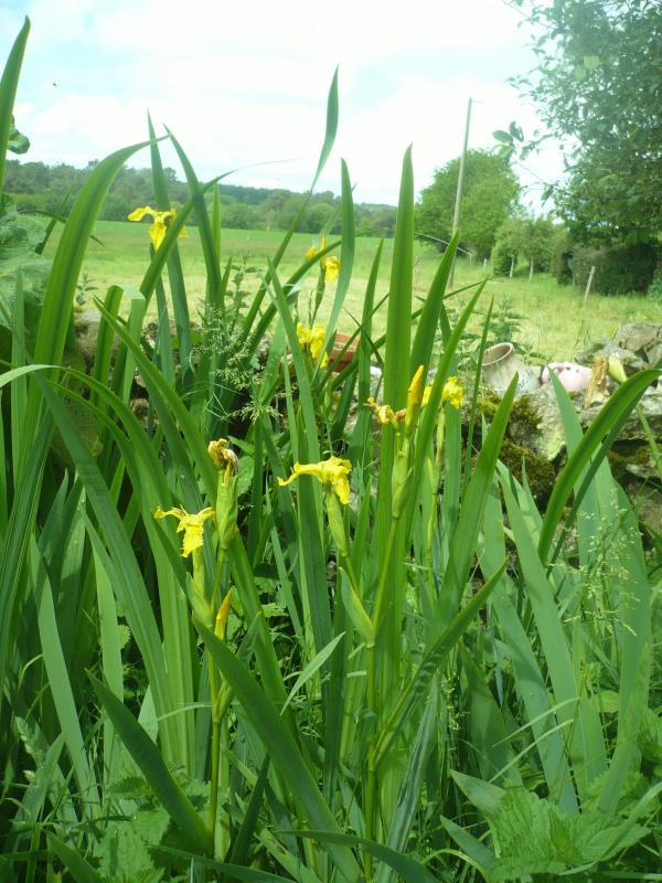 Là sur le devant de la grange, mon mari à installer une réserve d'eau, moi je commence un chemin d'ardoise, ou j'ai repiquer une bouture d'hortensia de chaque côté, rosier, bulbes, il y a déjà des gros iris et primevères qui fleurissent au printemps !