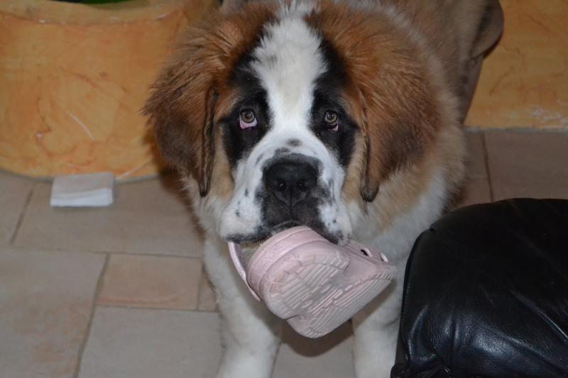 Ben voilà maman arrive, elle n'est pas trop d'accord là !!!!! HA ses crocs faut pas y toucher, de toute façon c'est vraiment trop tard il y a pleins d'empreintes de mes petites dents, bon entre temps je vous signale que j'ai grandi j'ai bientôt 7 mois et plus de 30 kg.