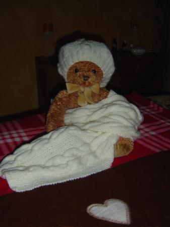 Je l'ai tricoter pendant mes longs mois couché, elle est bien chaude, je pense que je vais rajouter encore quelques pelotes de laine. Mon mari la nomme la couverture yolé yolé cela le fait rire