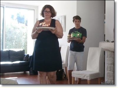 et pour l apéro une 2ème surprise, mon fils et ma belle fille avait fait la route pour venir diner à l improviste avec nous et surtout pour souffler les bougies des gâteaux car ma fille (dans la confidence en avait acheté 2 mais je n avais pas assez de bougies alors elle a mis mon âge sur l un et mon année de naissance sur l autre!!!!!!!!!!!!!!)