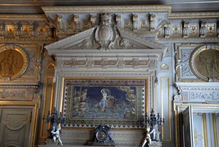 L'oeuvre de Tuby, d'après un dessin de Le Brun, s'inspire de la légende d'Apollon, dieu du Soleil et emblème du Roi.