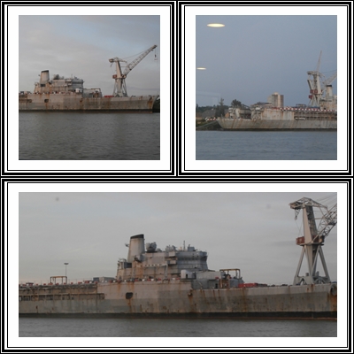 je vous avais dit qu à Pauillac arrivaient par voie maritime les éléments de l A380 - et hier justement un des 2 bateaux était amarré à Trompeloup alors nous en avons profité pour y aller mais la manoeuvre de transbordement sur la barge qui va jusqu à Langon était finie - comme la marée était basse on n a pas pu voir la barge qui est juste derrière le bateau (celui-ci était le "Ville de Bordeaux" )