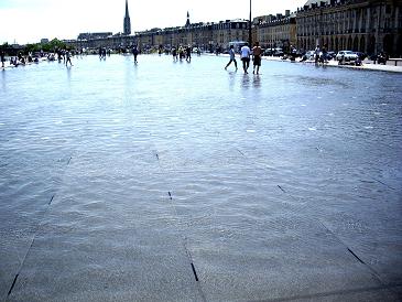 le fameux miroir d eau crée par l Architecte qui permet de refleter la magnifique place de la Bourse - mais qui sert surtout aux plaisirs de tous de se rafraichir surtout l été car malheureusement en hiver il est à sec - mais sert de terrain de jeux et de forum de discussions pour toute la jeunesse bordelaise !