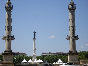 à l opposé, côté Garonne et pour faire un "balcon" sur le fleuve, les colonne rostales : hautes de 21 m. chacune est ornée de quatre proues de galères prolongées de rostres formés de deux faisceaux de trois glaives qui signifient la maîtrise triomphale des mers (en souvenir des victoires romaines sur celles de Carthage) - au dessus figurent les symboles de la Marine et du Commerce - et sur les chapiteaux on y retrouve des symboles représentant le Commerce et la Navigation - et depuis les quais cela fait une belle perspective