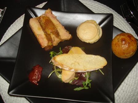 En entrée;Foie gras de canard au pommes caramélisées,un toast avec du foie confit,une petite salade,un macaron farci d une mousse,une prune au vinaigre ,le tout accompagné d un petit pain aux céréales Nous avons choisis du champagne avec la première entrée.... Seconde entrée;pot au feu de sole farcie de coquille st jacques aux légumes de saison,ravioli de homard aux chicons,émultion à la noix de coco et a la citronnelle