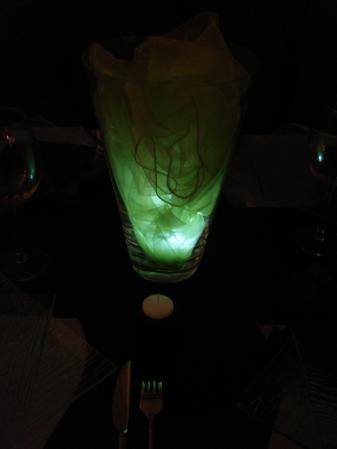 alors la je vous dois des explications........................en faite j'ai mis une petite lampe leed dans mon tissu dans le fond du vase et je vous assure que cela donnais un très bel effet avec le noir!! mais avec l'appareil photo on se demande un peu quoi........désolée photo ratée.
