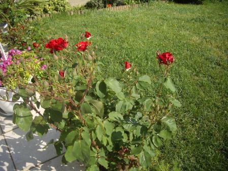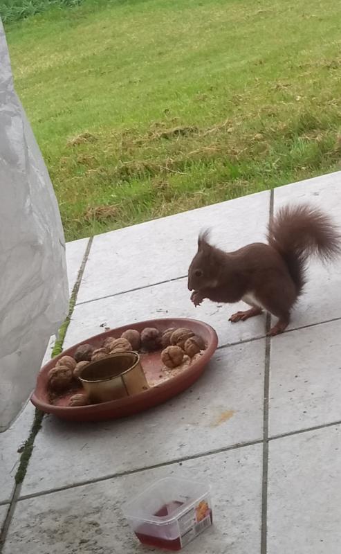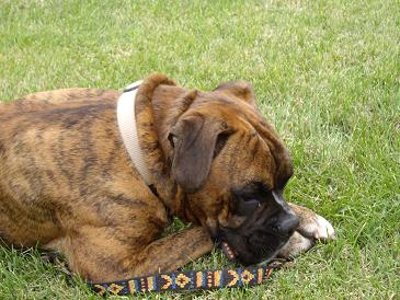 le chien de mon fils qui vient nous rendre visite de temps en temps et que bien sur nous gardons aussi - c est un boxer de presque 2 ans et qui a besoin d espace pour se défouler (ce qu il ne peut pas faire en ville) le seul hic c est qu il n est pas très obeissant - la dernière fois qu il est venu il a réussi à "lever" un chevreuil qui se reposait dans le champ d à coté malgré nos appels - alors par sécurité nous l attachons au platane avec tout de même un long filin ce qui lui permet de nous voir et nous entendre dans la maison (sinon il pleure) mais il est tout de même heureux ensuite de retrouver son petit bout de jardin au moins il est chez lui......et il est tellement mignon!!!