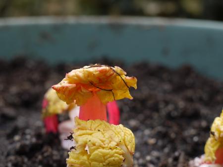 Nous étions invités hier midi chez ma meilleure amie "Princess" et j'ai récupéré ce qu'elle avait trouvé "abandonnée" sur un trottoir. Un pied de rhubarbe en pot, qui avait bien soif. Ray a tenu à porter le pot tout seul et l'a posé sur la terrasse. La pauvre rhubarbe était bien assoiffée. Feuilles pendantes. Nous l'avons arrosée et ce matin, feuilles redressées et fières. Je me demande si l'on peut conserver une rhubarbe en pot ou si je dois la planter en pleine terre Je demande donc un grand conseil à mes lecteurs !!