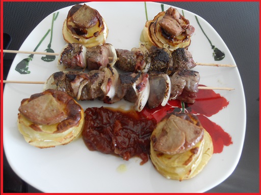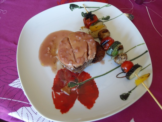 Des tournedos Rossini cuits sur mon nouveau BBC J'avais peur qu'ils ne soit pas assez saisis Mais non sur la plancha ils étaient super bien cuits. Je les ai ensuite passés sous le grils de mon four avec la tranche de foie gras à peine deux minutes.Posés dans les assiettes sur un toast de pain de mie rond cuit aussi au BBc Le tout servi avec une sauce au vinaigre de framboise.(préparée dans mon saucier) Des brochettes de légumes en accompagnement. Tout le monde à boudé mon plateau de fromages. Attendant le dessert.