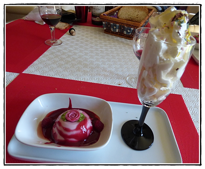 Je l'avais prévu léger le repas étant assez copieux Une mousse de fromage blanc saveur amande avec des pépites de chocolat et des fraises. Nous avons passé une très bonne journée |
