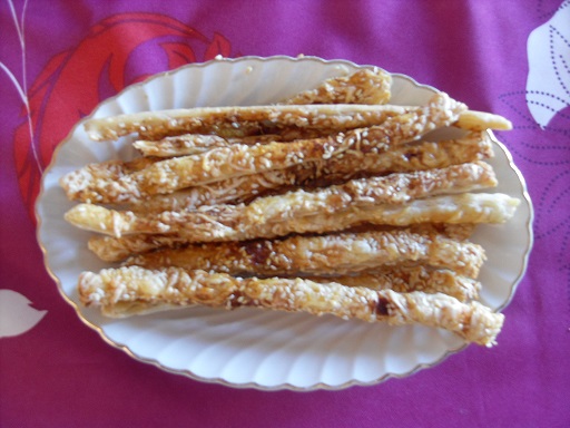 petites ficelles (pâte feuilletée dorée à l'oeuf, gruyère,paprika, graines de sésame