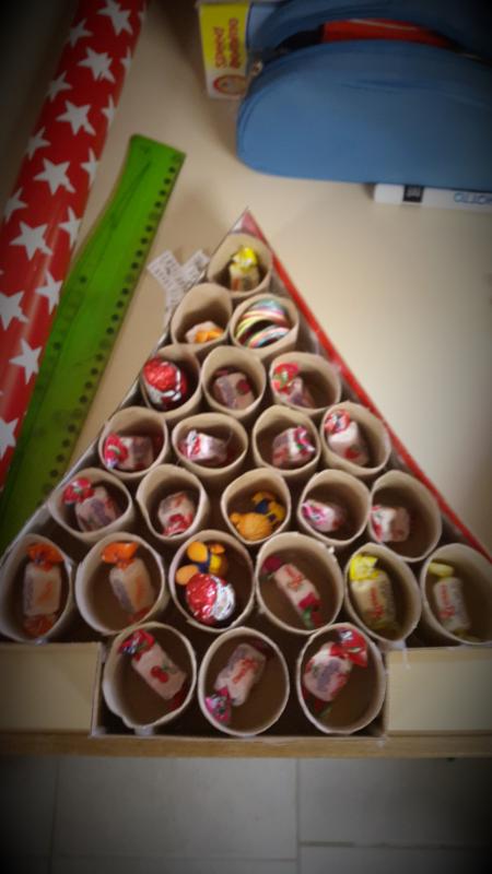 Je vous propose de créer un calendrier de l'avant simplement avec du carton, des rouleaux de papiers toilettes des friandises.