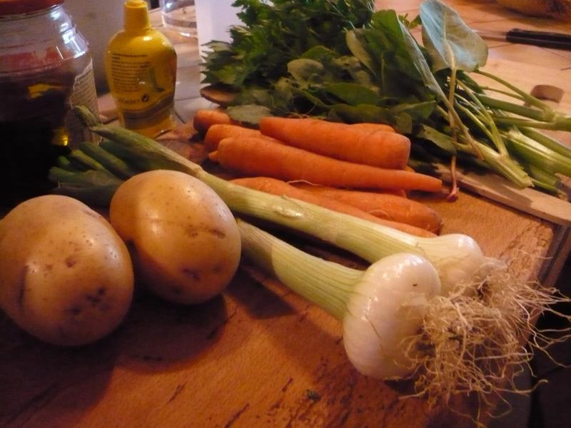 2 pommes de terre 4 carottes, une petite botte d'oseille, 2 oignons, une botte de persil plat, 2 branches de céleri (perpétuelles) 2 échalotes, 2 cubes, 3 litres d'eau. Nous épluchons tous les légumes pour bien les nettoyer, nous les coupons en morceaux.