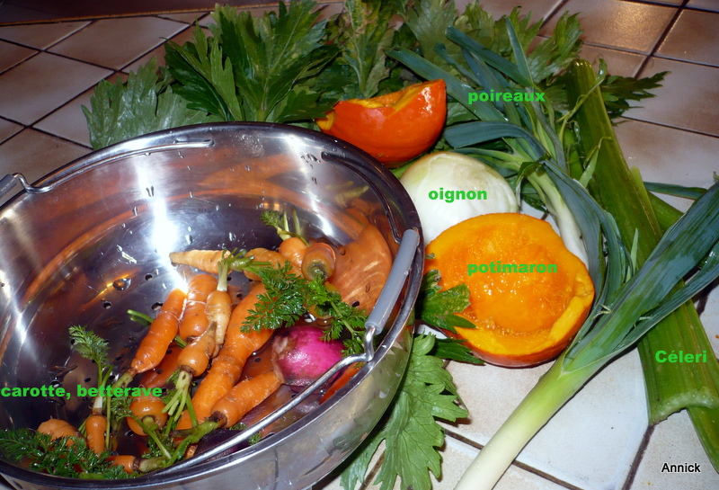 Un peu d'oseille, du céleri perpétuel, des carottes, 2 pommes de terre, 4 petits poireaux, 1 gros oignon, une petite feuille de chou, 1 courge (graines de Nadou), 2 cubes, 2 l d'eau. Tout les légumes sont petits mais quel parfum et quel gout.