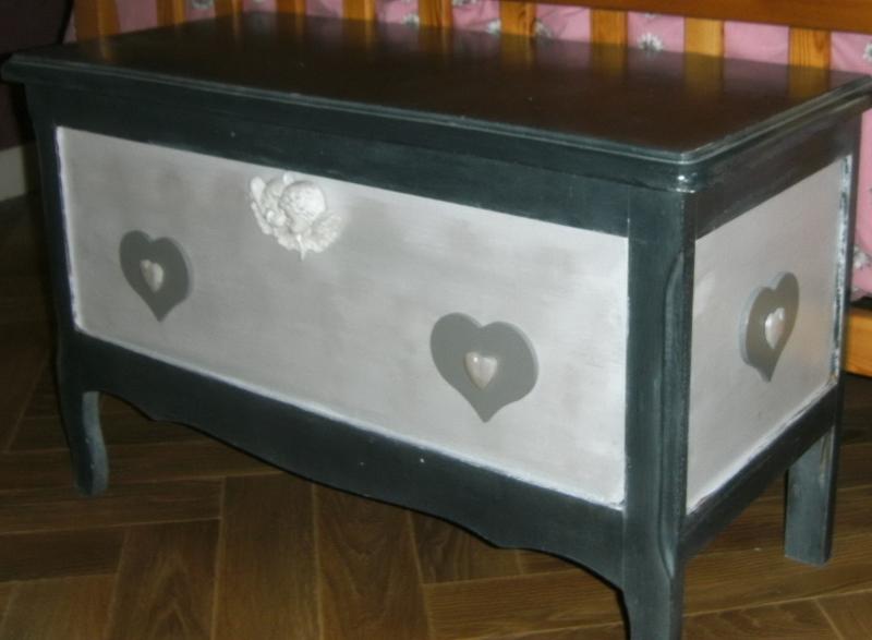 Je le trouvais un peu trop foncé pour l'endroit où il trône maintenant, j'avais envie de le relooker depuis un certain temps. Me voilà décidée: un peu de peinture blanche pour l'intérieur ..... Des coeurs en bois de 2 dimensions, de la peinture grise et nacrée.