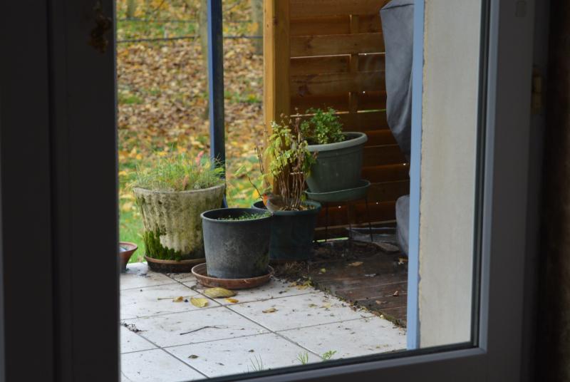 tous les matins ce petit rouge gorge vient sur la terrasse pour ramasser les miettes tombées de la maison-mangeoire