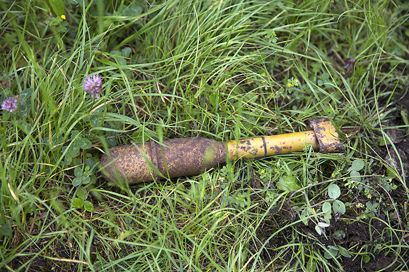 Les trouvailles? des clous, des boites de sardines, des bouts de ferraille indéterminés... Ces "déchets" seront rapportés dans une poubelle pour être emportés en déchetterie. Un chanceux trouve une bague, un autre un tire-bouchon, un autre encore une pièce ancienne.... Quant à nous? Premier essai....coup de maître ! On trouve au bord du sentier une grenade antichar de quelques 40 cm de long !