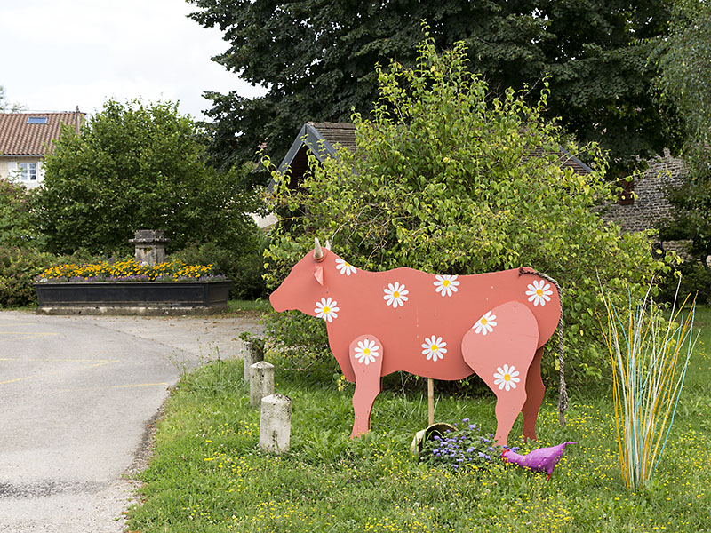 Peu de maisons neuves, une belle petite église (hélas fermée), un lavoir, des fontaines, un château...tout ce qui fait le charme de nos campagnes. Mais ce n'est pas ce patrimoine rural qui m'intéresse aujourd'hui..... Figurez-vous que près de la Mairie, je croise les trois petits cochons !