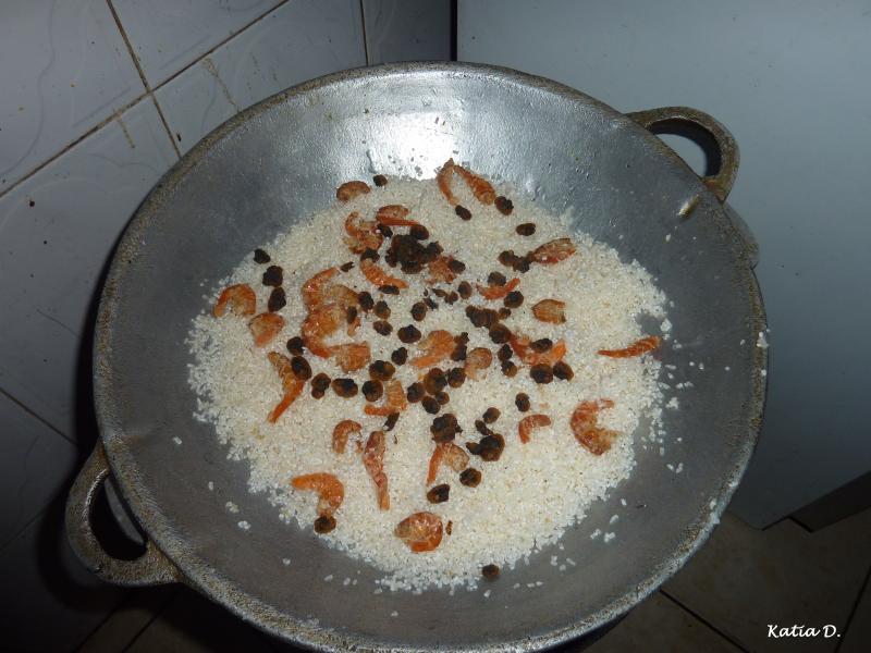 Couper le poivron en petit morceau et le piler avec le dernier tas d’oignons. Rajouter le tout dans la marmite. Trier et laver le riz. Le mettre dans le indé (couscoussier) avec dessus les crevettes séchées et les pagnes (coquillages séchés) et faire cuire à la vapeur environ 10 min. Retirer le poisson et les légumes de la marmite avec un peu de bouillon et réserver au chaud. Goutter le bouillon et rectifier l’assaisonnement si nécessaire. Plonger le riz, les crevettes et les pagnes dans le bouillon. Le bouillon doit juste recouvrir le riz. Baisser le feu, couvrir et laisser cuire 40 minutes. Au bout 15 minutes, faire un trou dans le riz et y enterrer la boule de soul. Bien la recouvrir. Refermer le couvercle et laisser finir de cuire. Enlever le boule de soul. Dresser le riz mélangé avec les crevettes et les pagnes dans un plat de service. Poser le poisson au centre du plat et entourer de tous les légumes. Arroser légèrement le riz du bouillon que vous avez précédemment prélevé. Gratter le fond de la marmite et mettre le khogne (riz grillé) dans une assiette à part. Au Sénégal tout le monde mange dans le même plat on met devant chaque convive un peu de soul et un peu de beugueuthe et on propose du khogne. Vous pouvez également proposer des quart de citron pour ceux qui le désir.