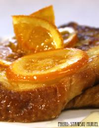 Trempez chaque tranche de pain imbibée de lait dans l'omelette, puis mettez-les dans la poêle. Retournez-les dès que la couleur est dorée et déposez-les dans un plat. Décorez d'une ou plusieurs rondelles d'oranges sur chaque tranche. Arrosez du sirop de miel.