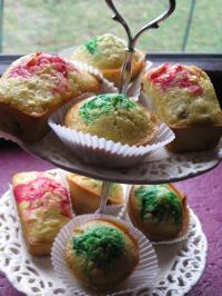 Ajoutez 1 cuillère à café de colorant jaune à la pâte. Répartissez dans des moules à cakes individuels. Laissez tomber une goutte de colorant (rouge ou vert) sur chaque petit tas de pâte.