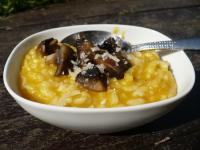 250 g de riz carnaroli pour risotto 400 g de citrouille 350 g de champignons de Paris 50 g de parmesan rapé 1,5 litre environ de bouillon de légumes Huile d'olive Beurre 1 oignon Sel, poivre
