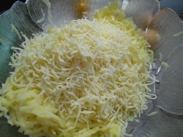 2 oeufs 550 gr de pdt 125 gr gruyère râpé 1 oignon,1 gousse d'ail 6 tr de jambon 6 tr de fromage Sel,poivre,musade Préchauffer le four à 180° Râper dans un plat les p.d.t,ajoutez l'oignon coupez en pt morceaux ainsi que l'ail. Ajoutez les oeufs,fromage,épices et bien mélangez. Etallez la préparation sur une feuille de papier bien étallez et cuire 35'