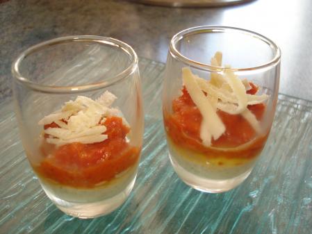 mousse de courgettes;couper en pts dés une courgette et cuire 10min dans de l'eau bouillante salée,ensuite bien laisser égoutter;mixer en ajoutant des feuilles de basilic frais et quelques copeaux de parmesan pour obtenir une purée,rectifier l' assaisonnement et laisser refroidir. Dresser la verrine;1 couche de mousse de courgette,quelques pts dés de fèta,1 tomate sèchée et quelques copeaux de parmesan |