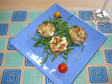 J ai coupé les pieds des champignons et les ai mixé avec 2 échalotes ensuite les faire revenir doucement dans une poèle et ajouter un morceau de courgette et 2 tomates que j ai également mixé,j ai mixé tous mes ingrédients car je voulais que ce soit tous petits morceaux pour farcir mes champignons.laissez cuire vos pieds de champignons av vos légumes av sel,poivre,paprika,persil haché , après 15min,farcir vos champignons avec un peu de beurre d ail,puis votre mélange légumes et placez au four 10min ensuite parsemez les de fromage rapé et laissez les encore 10min,je les ai servi sur un lit de roquette(oui je suis roquette en ce moment!!!j en mange encore et encore) |
