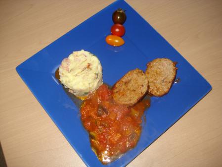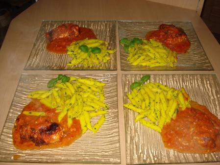 ingrédients pour 4pers. 4 escalopes de poulet,sel,poivre,1cube de bouillon de poule ou de légumes,1dl de vin blanc,1boite de tomates pelées de 800gr.(perso je prends tomates pelées au basilic),10feuilles de basilic,2dl de crème fraiche,125gr de mozzarella,1aubergine,ail en poudre. Laver et découper en dés l'aubergine,ensuite la faire revenir dans de lhuile d'olive ,saler,poivrer.ensuite a part faire dorer les escalopes de poulet(assaisonner)je rajoute selon l'humeur un peu d'épices pour poulet.Mélanger dans un grand plat le vin,le cube émietté,les tomates pelées,la C.fraiche et les feuilles de basilic,gouter car si nécessaire ajouter sel et poivre.La il est temps de préchauffer le four a 180°.Dans le plat allant au four disposer les petits dés d'aubergine saupoudrer d'un peu de poudre d'ail,ensuite disposer dessus les escalopes de poulet , arroser du mélange tomate.Couper en fines tranches la mozzarella et les disposer sur le tout.Enfourner 40min. |