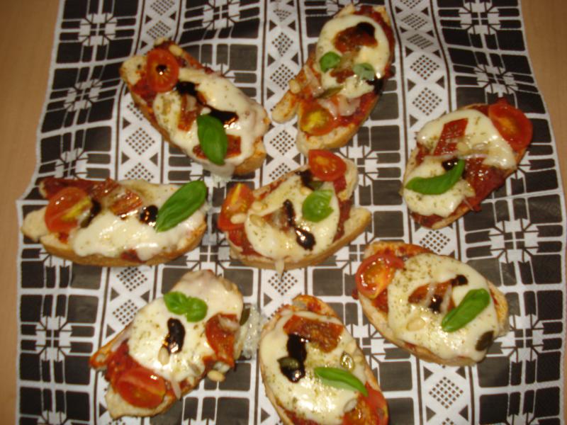 Un grand ciabatta coupé en tranches de 2cm épaisseur ,tartiner les avec du pesto rouge,garnir d'une tranche de mozzarella-1 tomate cerise coupée en deux-un peu de parmesan -un morceau de tomate sèchée-quelques pignons de pin.Passer vos crostinis 5 min au four,ensuite juste avant de servir ajouter une feuille de basilic et un peu de crème balsamique.