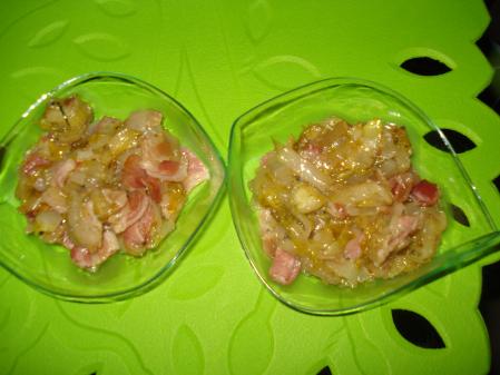 Ingrédients;+-600gr de hachis porc et boeuf-200gr de lardons fumés-+-7chicons(endives)600gr de pomme de terre-1 éclat d'ail-100gr de gorgonzola-beurre-1 cube de bouillon de légumes-chapelure-noix de muscade-sel-poivre