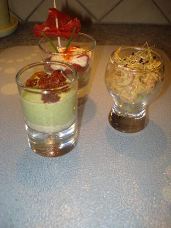 Verrines au surimi;mélanger du riz blanc cuit (froid)avec un peu de jus de citron vert,un rien de jus d'orange pressé,un peu de crème fraiche,mayonnaise,sel,poivre,1 échalote finement émincée,1 gousse d ail émincée,un avocat bien mur coupé en tout petits dés et pour terminer du surimi rapé placer ce mélange au frais au moins 2h ensuite garnir vos verrines en ajoutant une demi tomate cerise et une feuille d'endive(chez nous chicon)