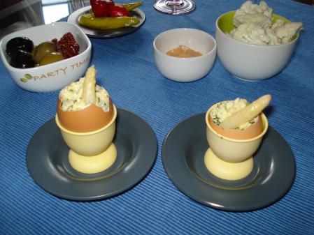 ce soir petit apéro a deux....nous nous sommes arrèté chez le traiteur italien et olives farcies a la fèta!!piment farci (pour mich)tomates sèchées.......mmmmmmmmmm j'adore ca!!il me restais un peu de choux fleur au frigo que nous mangeons cru avec un peu de sauce cocktail.et puis le sommet de l'apèro...oui je vous le recommande les coquilles d'oeufs garnies de.................bon j'avoue j'ai piqué la recette dans l'émission un diner presque parfait(merci a philippe la candidat)