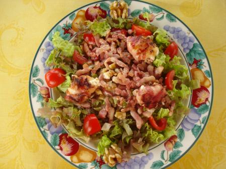 un mélange de salade ,des champignons crus coupé en lamelles,des coeurs d'artichauts ,un poivron jaune ,de la ciboulette et vu que ma ciboulette fait quelques fleurs,j y ai mis les fleurs dans ma salade car elles sont comestibles sans problème,un oignon rouge,des tomates sèchées et de la fèta (déja marinée en bocal),j ai ajouté une vinaigrette aux fines herbes
